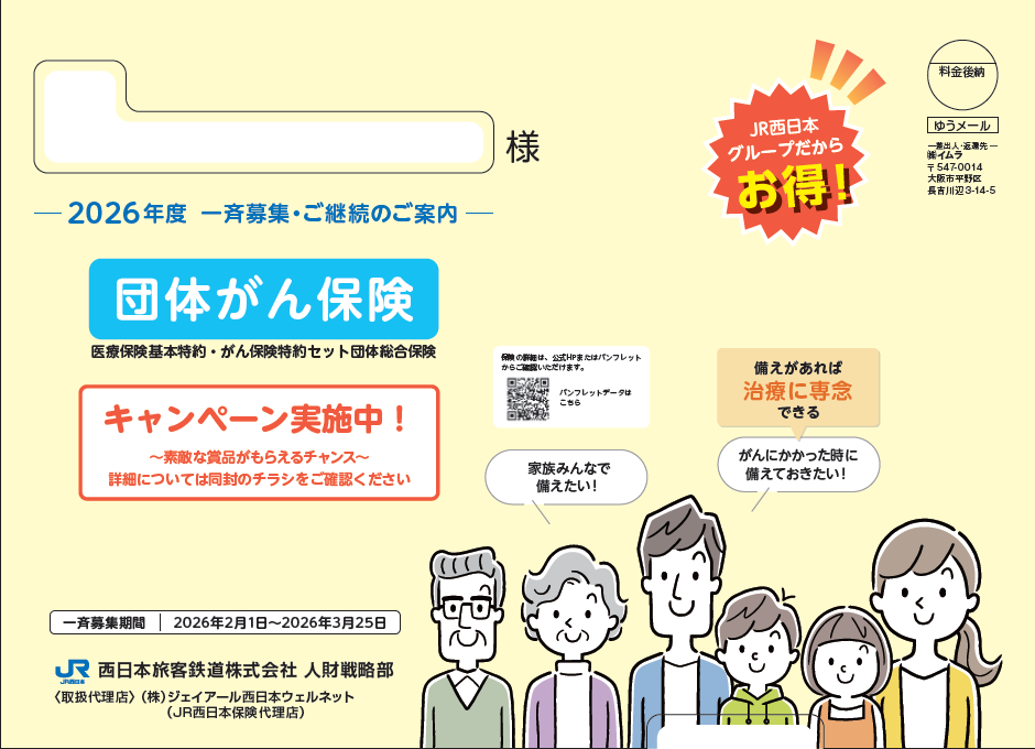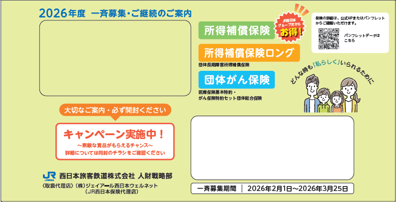 2026年2月1日より、JR西日本グループの団体保険である団体がん保険・所得補償保険・所得補償保険ロングの一斉募集を開始しております。