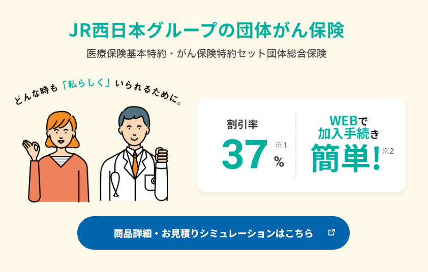 この団体保険はJR西日本グループの皆様を加入者(被保険者)とする福利厚生制度商品です。 スケールメリットを生かしたお手頃な保険料となっており、割安な保険料で充実の補償内容となっています。 お手元にご案内が届きましたら、まずはご一読のうえぜひご加入をご検討ください。