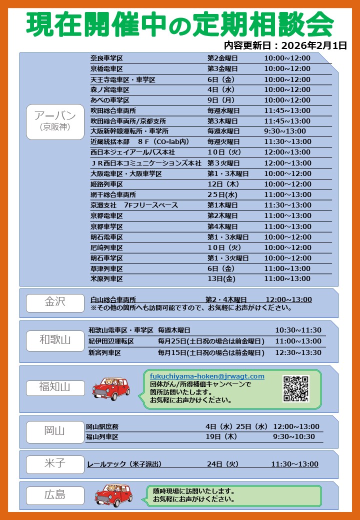【毎月更新】今月開催予定の相談会情報(2026年2月分) 2026.02.01 保険相談会 今月開催予定の相談会についてお知らせいたします!JR西日本保険代理店では、みなさまのご職場へ訪問し、保険相談会を実施しております。 実施場所や日時など、詳細はページ内の画像↓↓をご確認ください。 ※実施場所の詳細等は各店舗へお問い合わせください。※原則、各実施場所でご勤務されている方以外のご来訪はご遠慮ください。 お知らせ一覧へ
